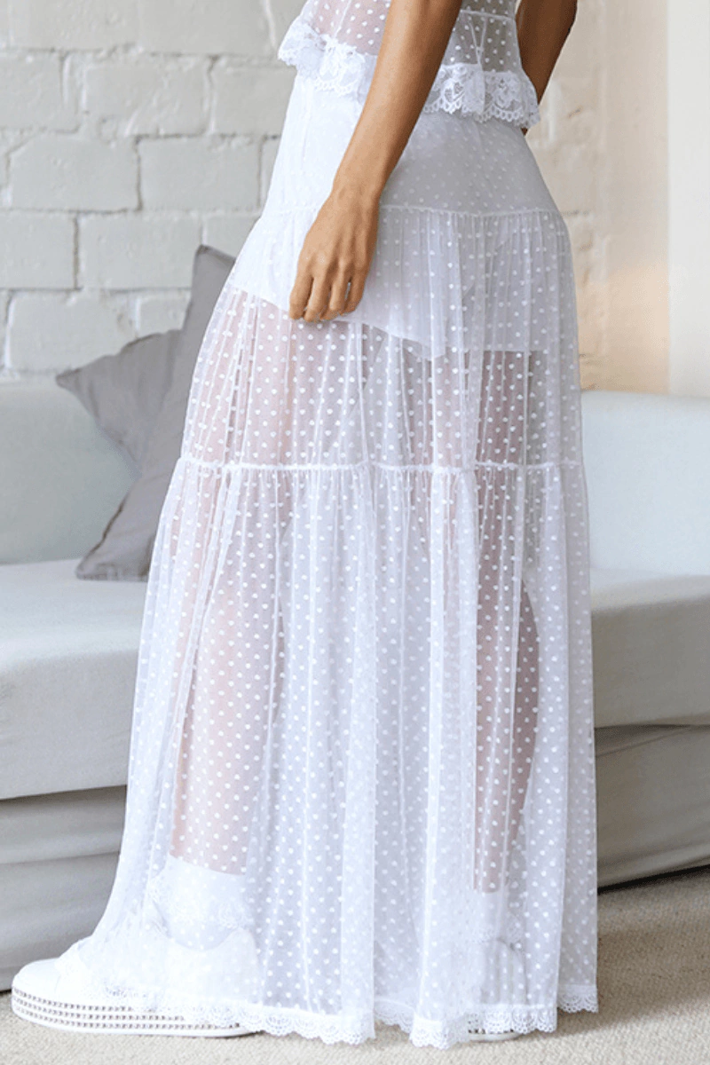 Feita inteiramente em tule de bolinha, essa saia cria um efeito leve e flutuante, com um jogo de transparências sofisticado. Camadas de babados ligeiramente franzidos são estrategicamente posicionadas: a primeira contorna o quadril, valorizando as curvas, enquanto a segunda, a partir do joelho, desce com volume e movimento, conferindo um efeito fashion. A cintura tem um elástico delicado, garantindo ajuste perfeito e conforto, e o acabamento com rendinha na barra adiciona um toque refinado. Versátil e sofisticada, pode ser usada com o shortinho como forro, proporcionando várias possibilidades de styling e adaptando-se a diversas ocasiões. Uma peça de tirar o fôlego que compõe diferentes looks de moda.